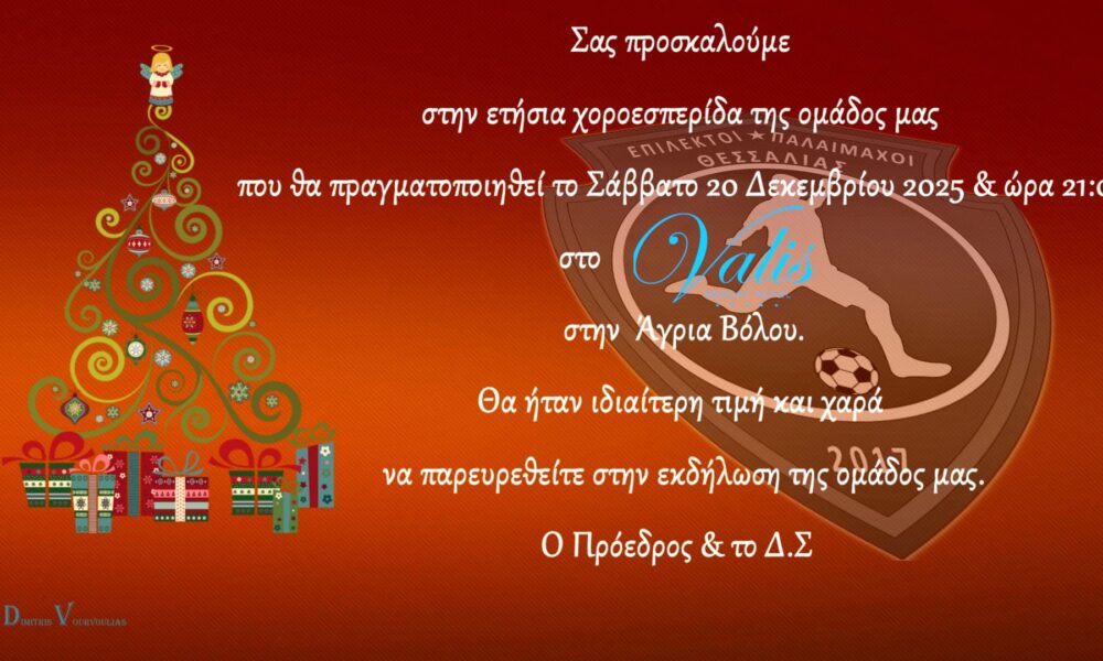 Η ομάδα μας «Επίλεκτοι Παλαίμαχοι Θεσσαλίας» διοργανώνει για έβδομη χρονιά την ετήσια χοροεσπερίδα της, το Σάββατο 20 Δεκεμβρίου και ώρα 21:00, στην αίθουσα εκδηλώσεων του...